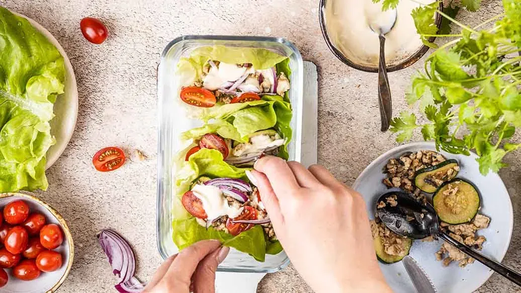 Varm vegetabilsk olje i en panne og sauter hakket rødløk (kun halvparten), kjøttdeig, Kikkoman Soyasaus og squash i ca. 5 minutter, til væsken har fordampet. Øs kalkun-squashfyllet oppå salatbladene. Del cherrytomatene i to, og legg dem på toppen sammen med resten av rødløken.
