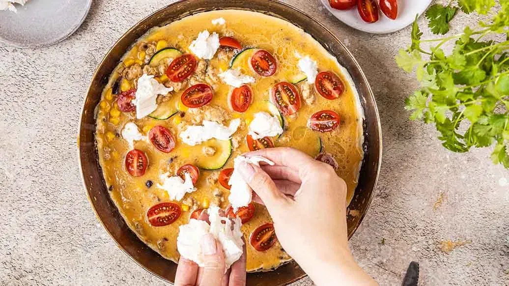 Del cherrytomatene i to og legg dem med skjæresiden opp på frittataen. Topp med revet mozzarella. Sett stekepannen i en forvarmet ovn ved 180 °C og stek i ca. 20 minutter eller til eggeblandingen har stivnet helt.