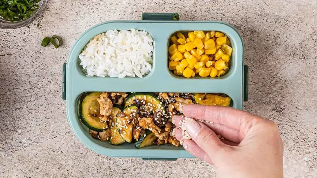Kok risen i henhold til anvisningene på pakken. Legg kokt ris, sukkermais og sautert kjøtt lagvis med squash og rødløk i en bolle. Dryss over sesamfrø og vårløk, og ringle over Kikkoman Soyasaus.