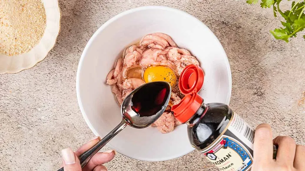 200 g kalkunkjøttdeig – 1 egg (rått) – 1 ss Kikkoman Naturlig Brygget Soyasaus – 0,5 ts pepper – 3 ss Kikkoman Panko - Sprød Brødrasp i Japansk Stil – 1,5 ss vegetabilsk olje