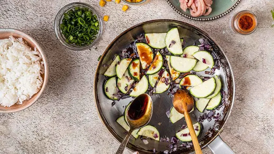 Sauter hakket rødløk og oppskåret squash i vegetabilsk olje. Tilsett kalkunkjøttdeig, Kikkoman Soyasaus og paprikapulver. Stek i 3–4 minutter til kjøttet er gjennomstekt og squashen litt mørnet.