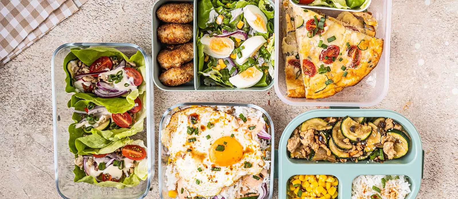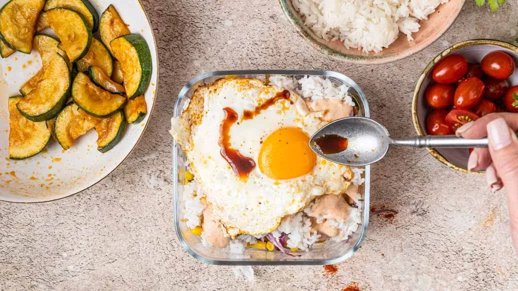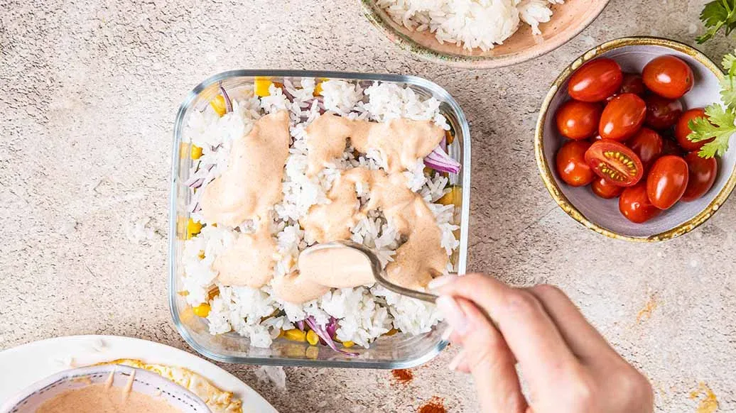 Stek eggene i pannen som ble brukt til squash. Bland yoghurten med paprikapulver og Kikkoman Soyasaus. Skrell og hakk rødløken. I en matboks legger du lagvis: en fjerdedel av den kokte risen, deretter halvparten av den sauterte squashen, halvparten av sukkermaisen og halvparten av rødløken, etterfulgt av enda en fjerdedel av risen. Øs over halvparten av yoghurtsausen. Gjør det samme i den andre matboksen.