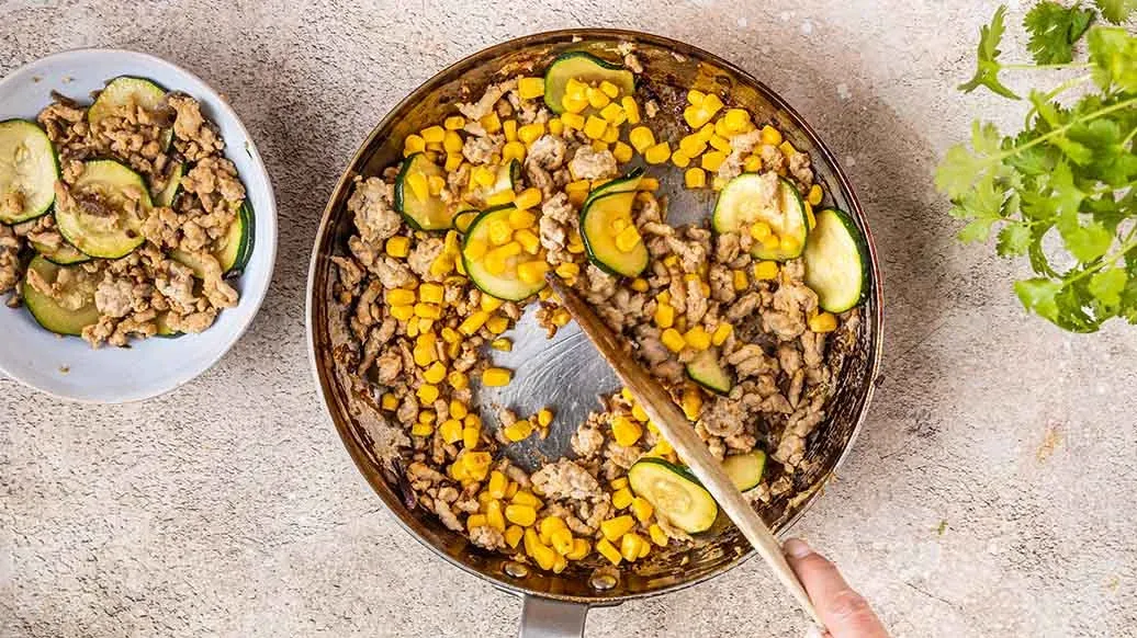 Varm opp vegetabilsk olje i en panne og sauter hakket rødløk, kjøttdeig, Kikkoman Soyasaus og squash i ca. 5 minutter, til væsken har fordampet. Rør inn avsilt sukkermais og stek i ytterligere 1 minutt. La deretter blandingen avkjøle seg litt.