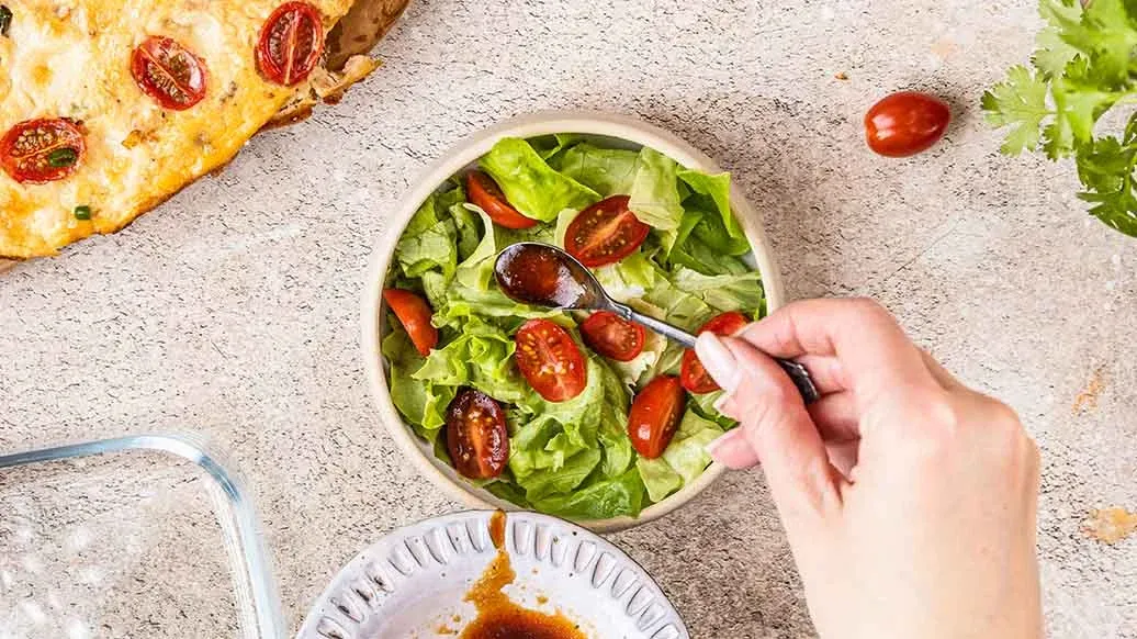 Del cherrytomatene i to og ha dem oppi salaten. Visp sammen vegetabilsk olje, Kikkoman Soyasaus og honning, og vend inn i salaten. Server som tilbehør til frittataen.