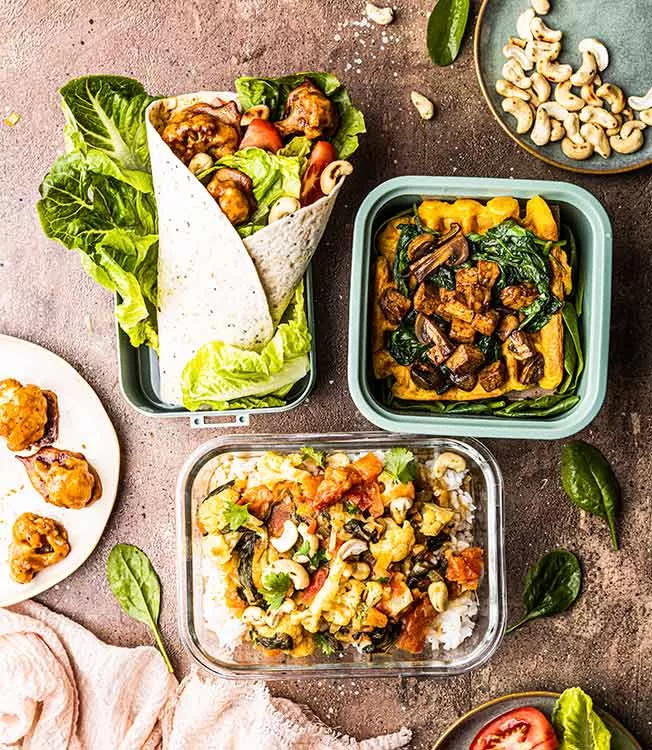 En herlig trio av velsmakende veganretter: gresskar- og gulrotvafler med spicy tempeh, en mettende blomkål-spinatcurry, og grønnsaksbiter med aromatisk BBQ-blomkål i tortilla. Minimalt med innkjøp, maksimal smak.